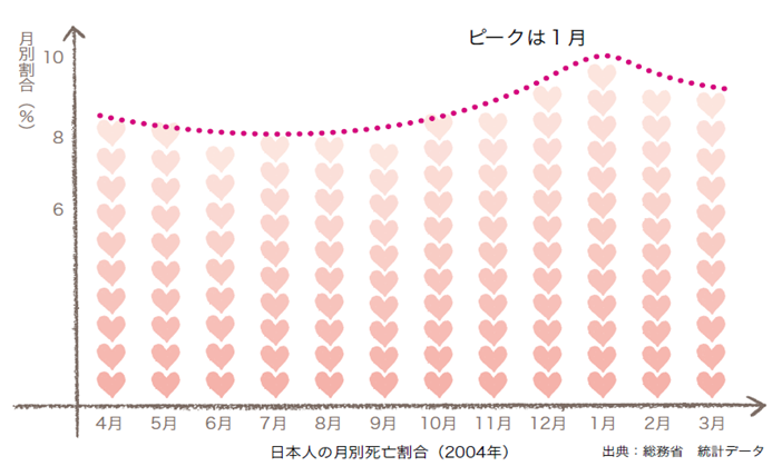 総務省の統計データをみると、日本人の月別死亡割合は1月をピークに冬増加し、夏は減少しています。この傾向は過去50年変わっていないということです。