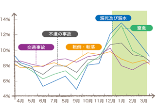 さらにこの内容を病気と事故にわけたグラフをみても、病気も事故も冬に死亡の割合が多いことがわかります。冬に増加する事故については、溺死・転倒などで家庭内で意識を失いそれが原因に死に至る事故になっています。