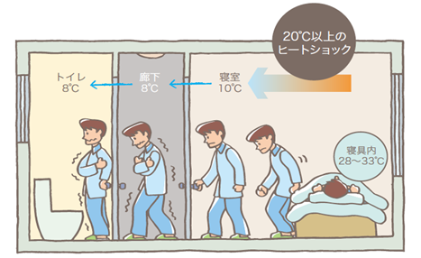 たとえば、夜中に寒い廊下やトイレに行くとき、寝室との温度差が10℃以上になることも。