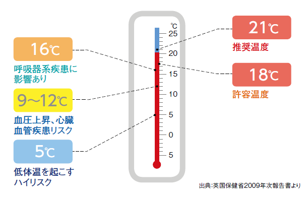室温が18℃未満になると、呼吸器疾患や血圧上昇などのリスクが高まるというデータもあります。
